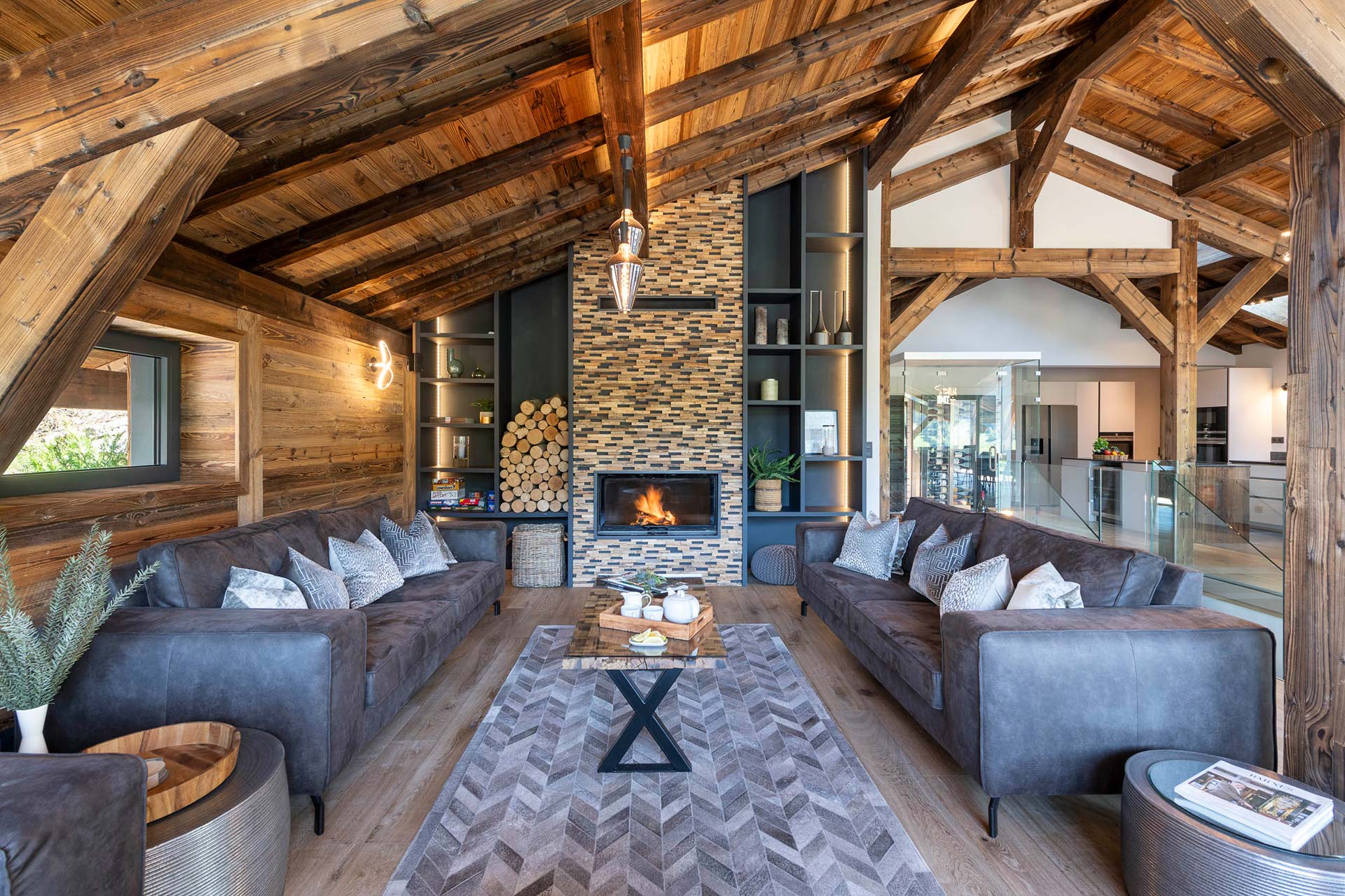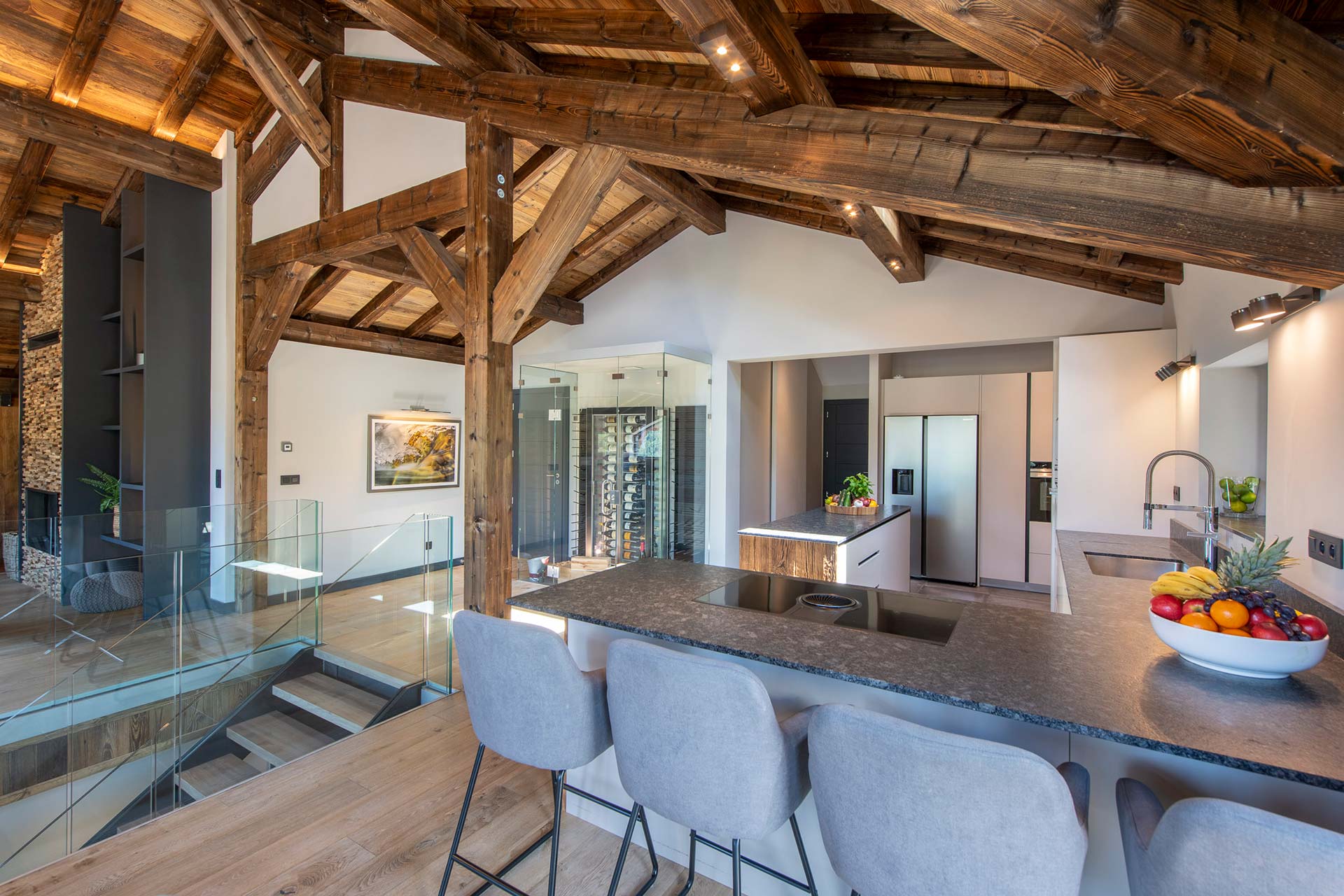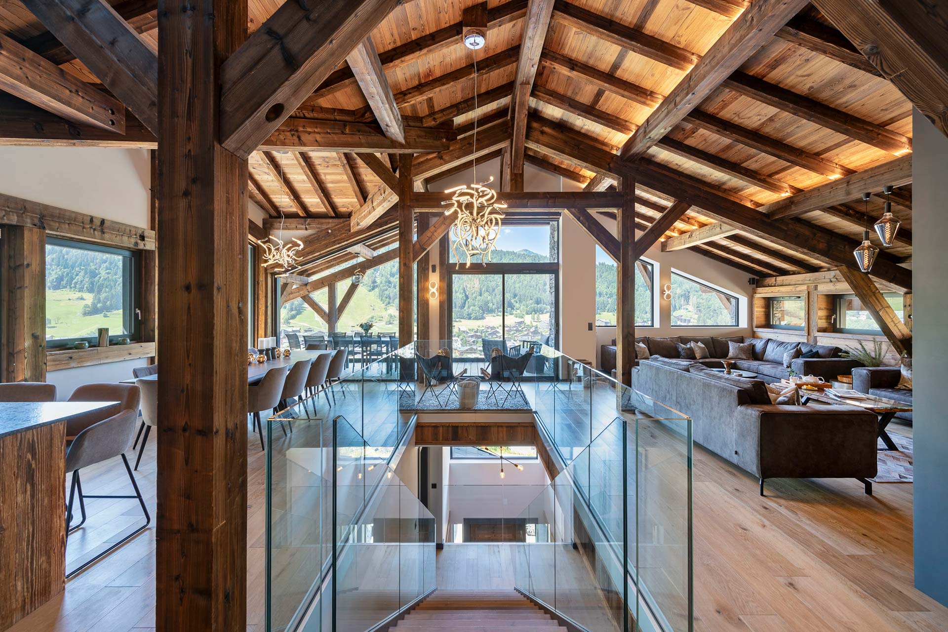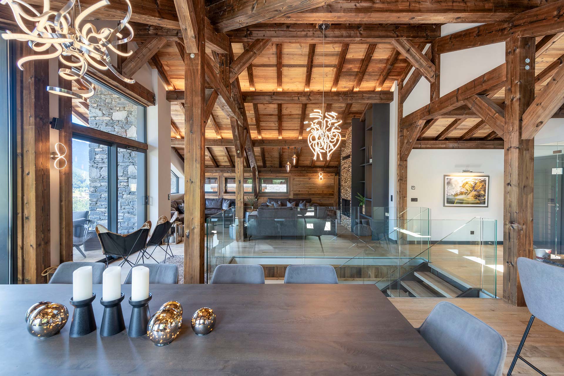 The main highlight of Chalet Griffonner is the space. Whilst the chalet only has four bedrooms, this is a large property with expansive living areas and facilities. The main living room is double height, opening up to the exposed timber frame and flanked by glass walls. The lightness and airyness of this space optimises what this property is all about – the luxury of space.