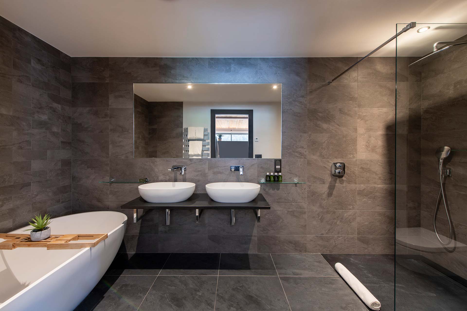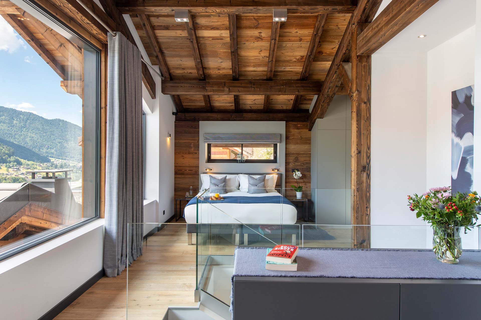 The chalet itself is a unique, one-off design, with luxurious features throughout. The standout is the main living space with its exposed timber frame and open plan layout. The glazing has been cleverly designed here, our favourite feature being the dual aspect window set in the south corner. This provides an expansive view which tracks from the Ressachaux, past the Pointe de Nyon, then Pleney and over to the Roc d’Enfer. The living space itself is a fantastic place to unwind with your group, there’s plenty of space but equally each zone flows and the layout ‘just works’. The chalet will also work really well for groups self-catering – the kitchen is really well specified and again, spacious, so this is a great property for any passionate cooks. The counter seating also makes it a social setting where you can enjoy drinks and discuss the antics of the day whilst preparing dinner.